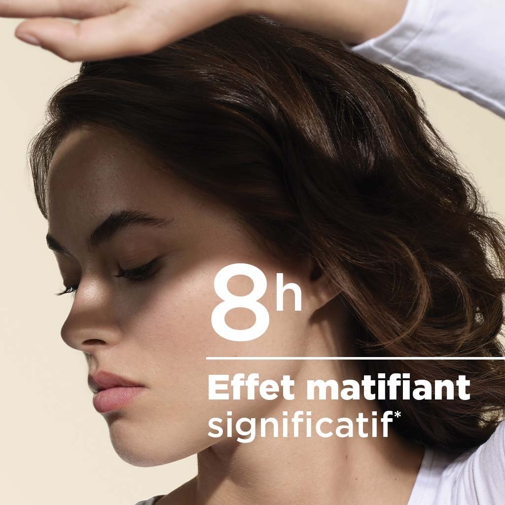 Evaluation de l’effet matifiant sur 10 volontaires de 22 à 46 ans ayant une peau mixte à grasse à tendance luisante, pendant 8 heures. Test d’usage sur 36 volontaires âgés de 19 à 62 ans ayant une peau sensible et mixte à grasse, pendant 21 jours.